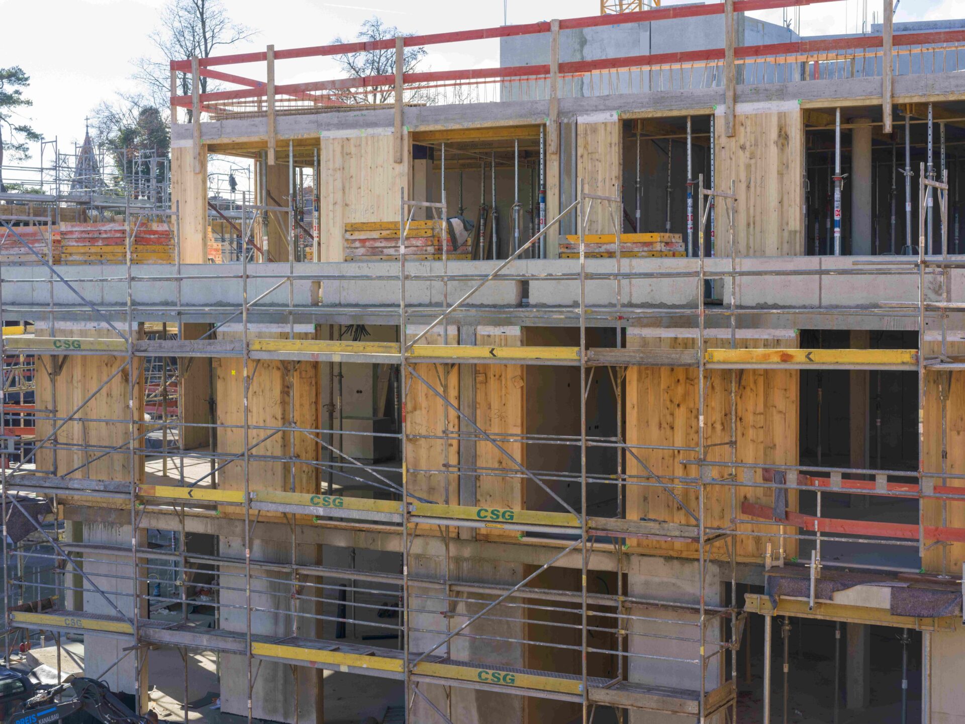 Bei den Gebäuden im Quartier FELDAFINGER HÖHE werden Außenwände von ebenerdigen Geschossen sowie statisch notwendige Wohnungstrenn-wände in Stahlbeton erstellt. Außenwände ohne Anschluss zum Erdreich werden in Massivholzbauweise errichtet. Die Holzmassivbauwände der Obergeschosse werden außen mit einer zusätzlichen Dämmung versehen und mit hochwertigem, witterungsbeständigem Thermoholz der Esche als hinterlüftetes System verkleidet. Durch die positiven thermischen Eigenschaften des Holzes ist eine geringere Dämmstärke als bei Betonwänden möglich.